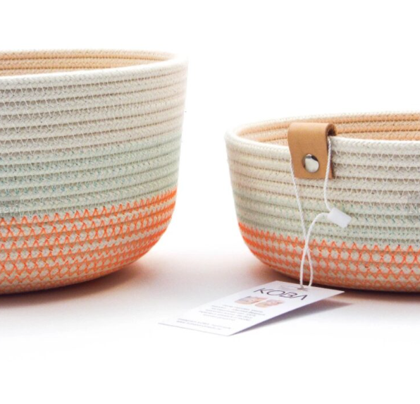 In haar kleine atelier in Brasschaat maakt Koba met liefde deze prachtige manden van gerecycleerd en Belgisch touw. Eén enkel lang stuk gerecycleerd én Belgisch touw wordt gebruikt om elk mandje te vormen met een eenvoudige zigzagsteek. Het einde van het touw wordt altijd afgesloten met een mooi lederen eindstuk. Handwerk made in Belgium van begin tot eind.