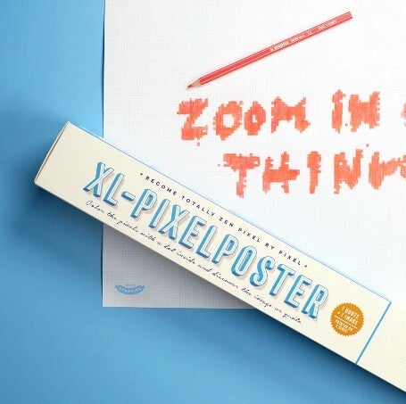 Op deze kwalitatieve poster van 65 x 100 cm vind je op de ene zijde een raster met een zebra om in te kleuren en aan de andere zijde een quote. Gekozen? Kleur dan de vakjes met een puntje in en ontdek zo de zebra en/of quote.