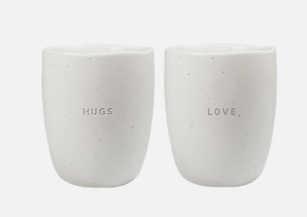 Perfect cadeautje voor een cappuccino- of thee-liefhebber, deze giftset van twee mooie mokken. De mokken zijn geglazuurd in een off white kleur en zijn allebei gegraveerd met een quote. Deze set bestaat uit de quotes 'Hugs' en 'Love'.