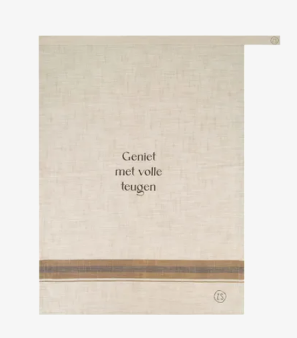 Theedoeken om van te genieten! De theedoek vertelt je iedere dag weer waar het om draait in het leven. Of in ieder geval tijdens het eten. Geniet met volle teugen! Deze theekdoek maakt het afwassen met die leuke tekst altijd een stukje gezelliger! De theedoek heeft een mooie naturelle kleur en een bruine band aan de rand. Er zit een handig lusje aan om ze op te hangen, want zo’n leuke theedoeken wil je iedere dag wel zien!