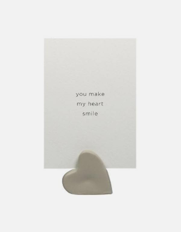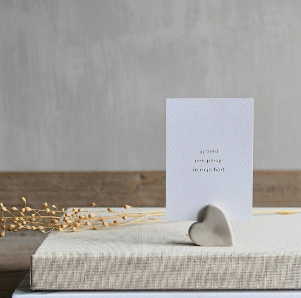 Deze mooie keramieken kaarthouder is gemaakt in een hartjesvorm en wordt samen met een mooie kwaliteitsvolle kaart verpakt in een leuk cadeauzakje. Op de kaart staat een tekst. Keuze uit "Jij hebt een plekje in mijn hart" - "Volg je hart want dat klopt" - "You make my heart smile" - "I love you mom" - "Met jou is alles leuker" - "A little love for you".
