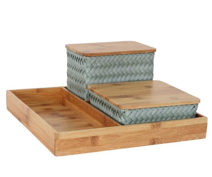 Breng wat orde in de chaos met onze Organize (F)IT! Dit mooie bamboe dienblad komt met twee hand gevlochten manden. Handig in de badkamer voor watjes en accessoires, of gebruik deze set om je werkplek overzichtelijk te houden en tegelijkertijd een trendy upgrade te geven!