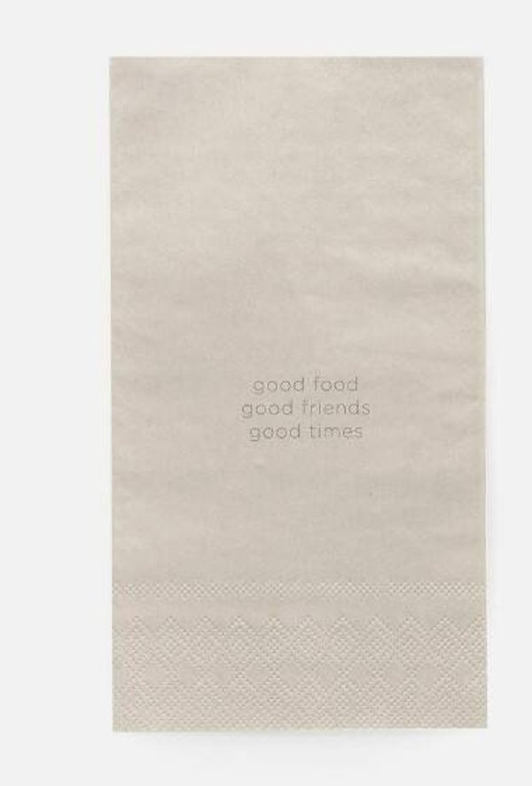 Op de grijze servetten staat "je bent om op te eten", op de zandkleurige staat "good food, good friens, good times".